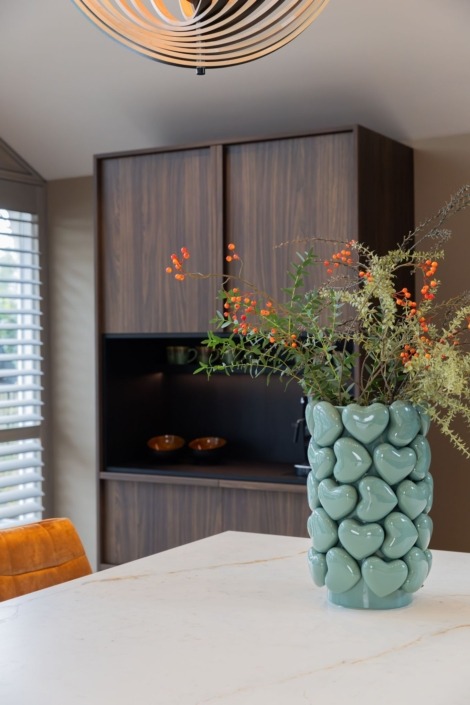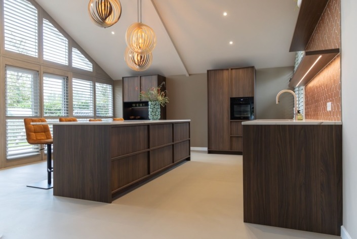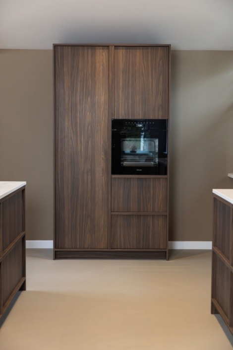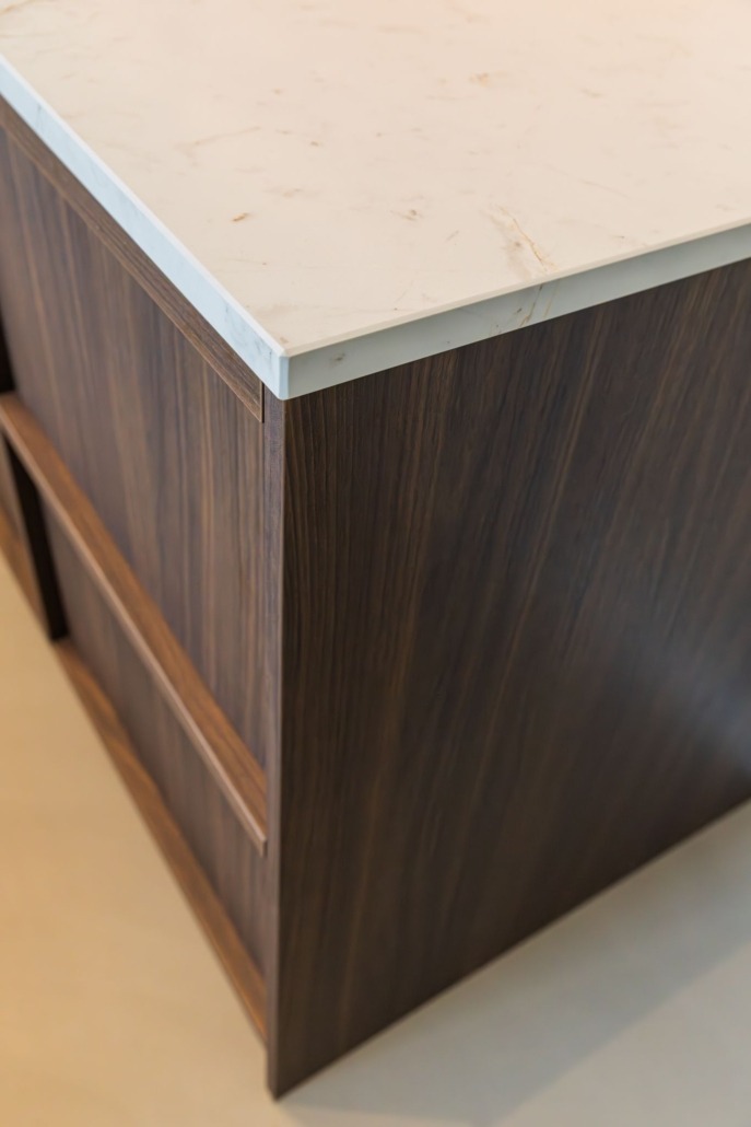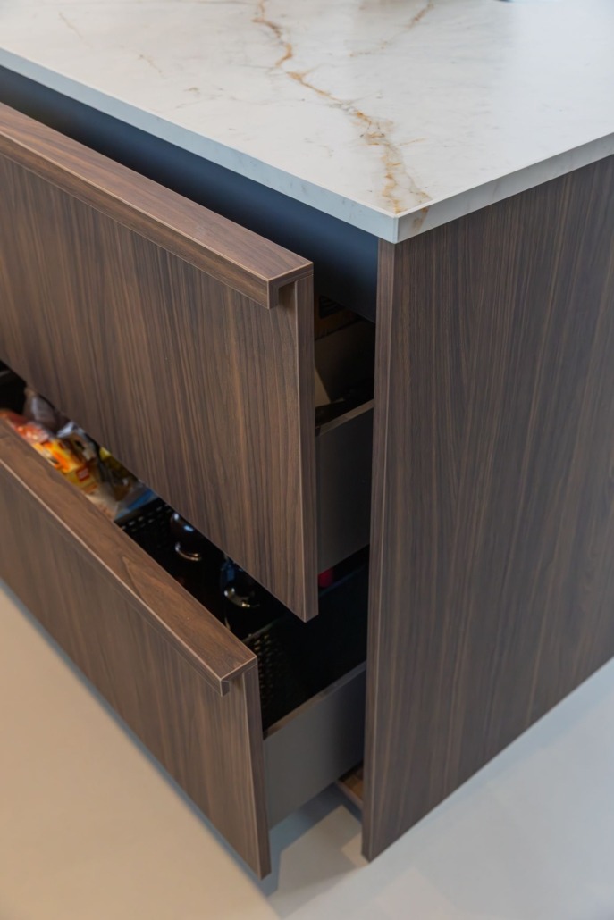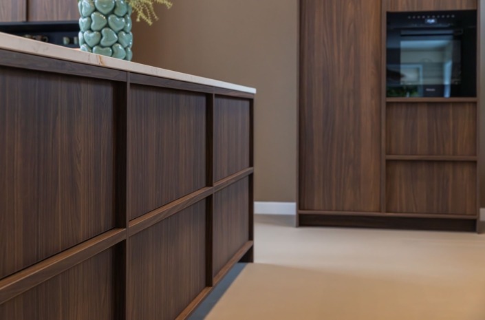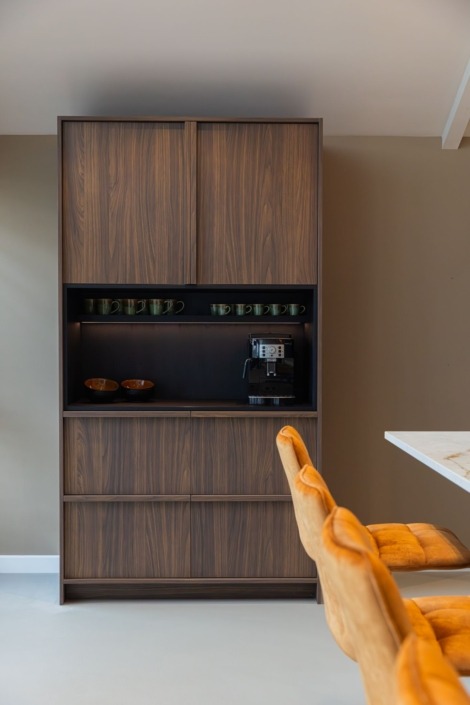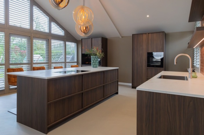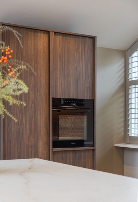 Het frontwerk is uitgevoerd in Decolegno met een warme, walnootachtige tekening. De kasten en laden zijn binnenin uitgevoerd in antraciet: praktisch en discreet. Op het werkblad ligt Neolith Abu Dhabi White Silk: keramiek met een zachte glans en fijne adering. Het blad geeft de keuken lichtheid, is sterk in dagelijks gebruik en laat zich eenvoudig reinigen.