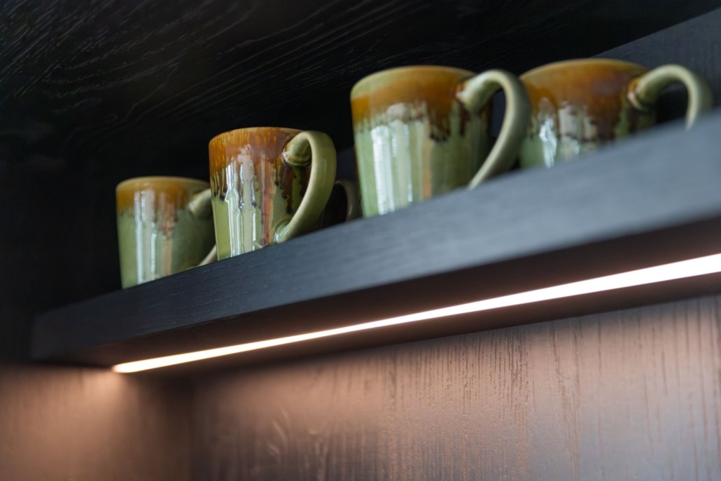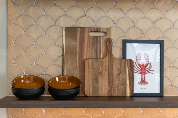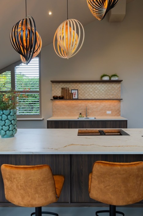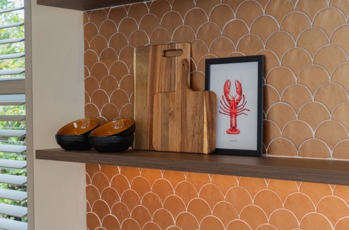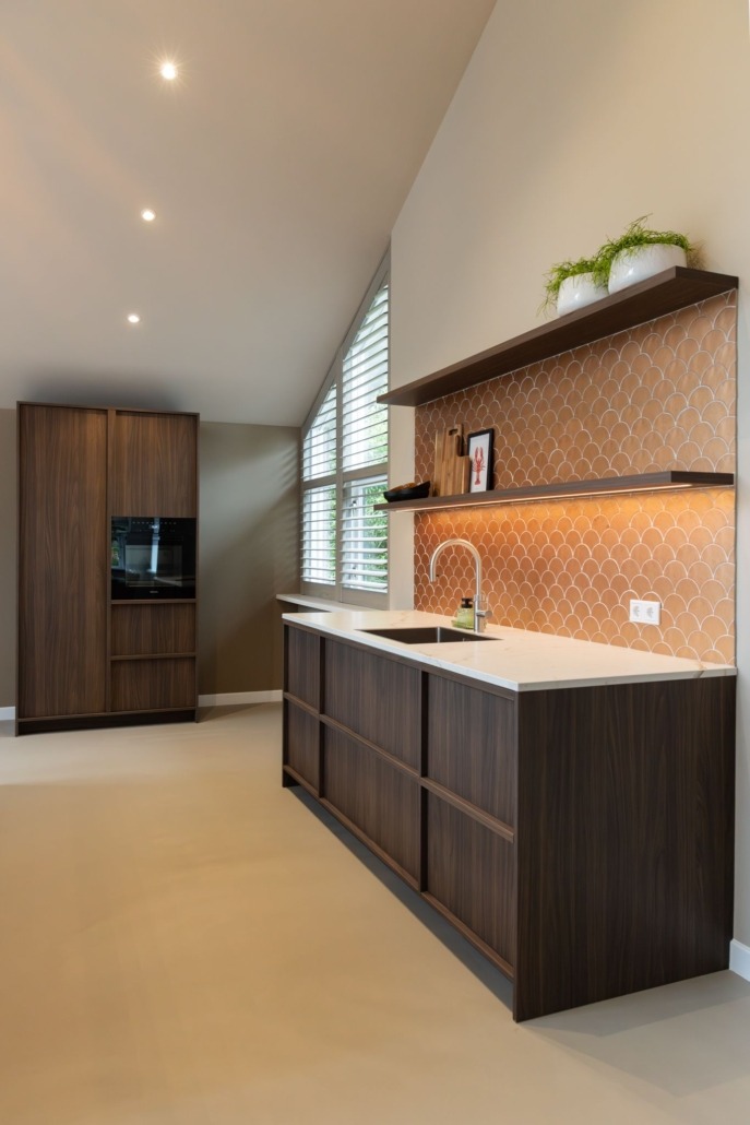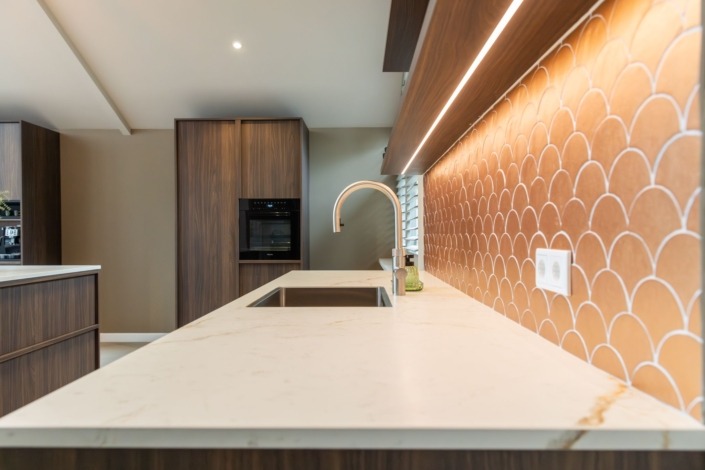 Langs de natte zone loopt een wand van door de familie gekozen, ambachtelijke tegels in een warme terracottatoon. De halfronde voegeenheden geven ritme; samen met de geïntegreerde verlichting ontstaat een rustige gloed boven het werkblad.
