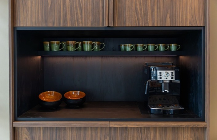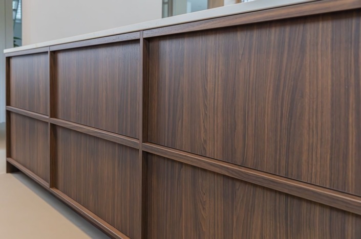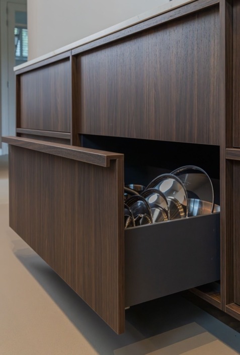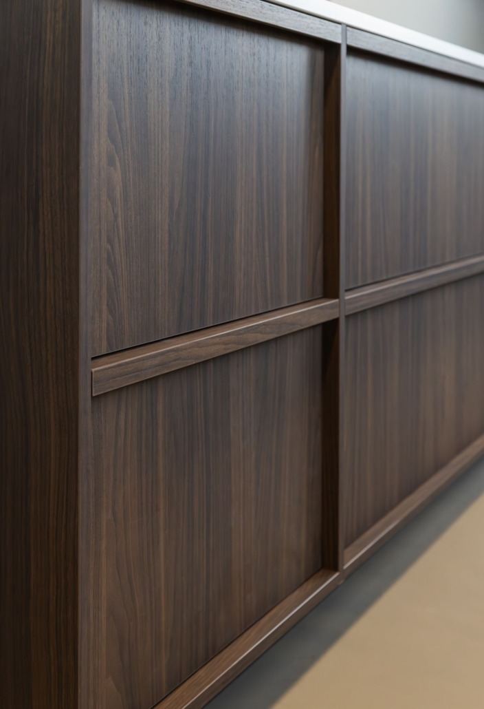 De grepen zijn op maat gemaakt in hetzelfde Decolegno-materiaal. Visueel doorlopend – zo blijft het front één geheel. De belijning van de grepen volgt het raster van de kastindeling en accentueert de horizontale rust.