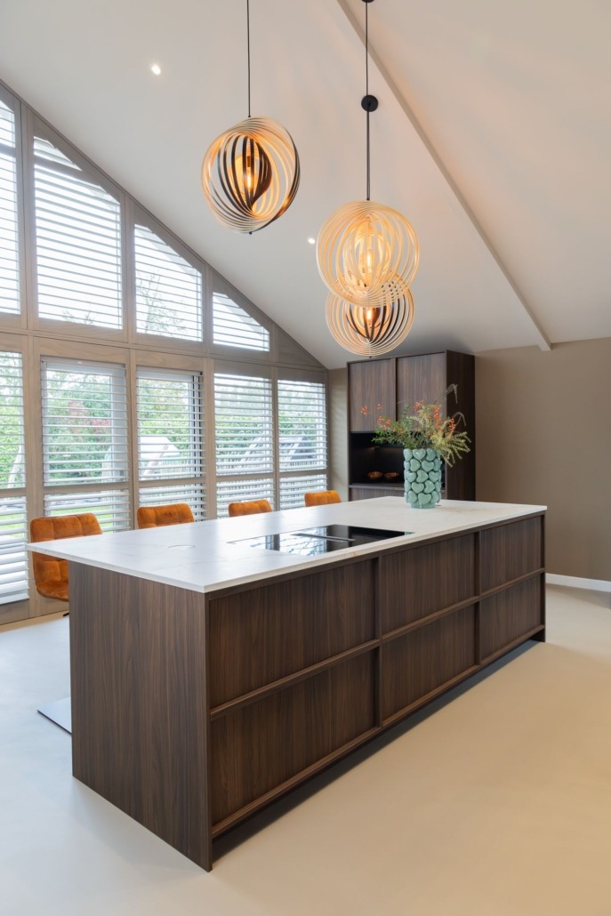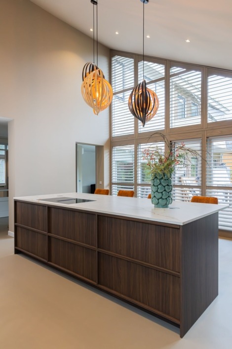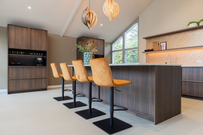 De hoge kap en de royale raampartijen geven de keuken licht. Daglicht strijkt over de fronten in laat de tekening in het materiaal werken. We hielden het maatwerk slank en ritmisch, zodat het volume van het eiland in balans blijft met de hoogte van de ruimte. De barkrukken nodigen uit voor ontbijt, huiswerk of een goed gesprek tijdens het koken.