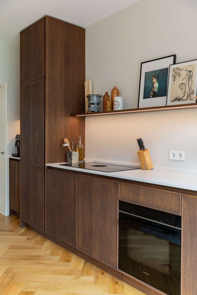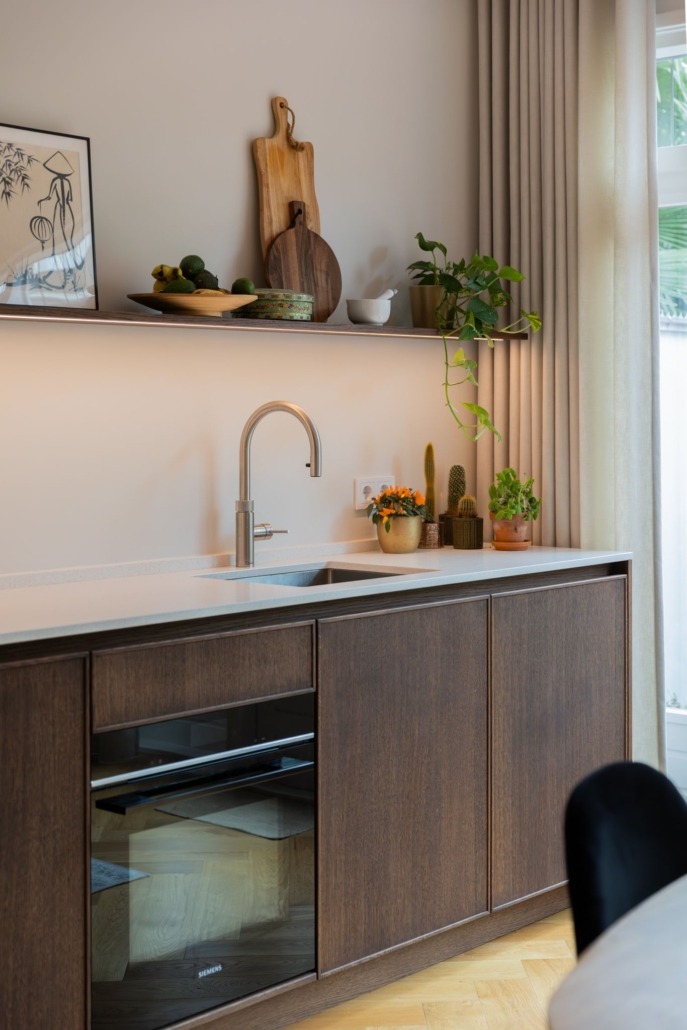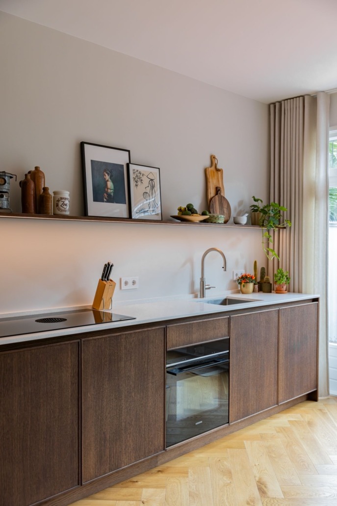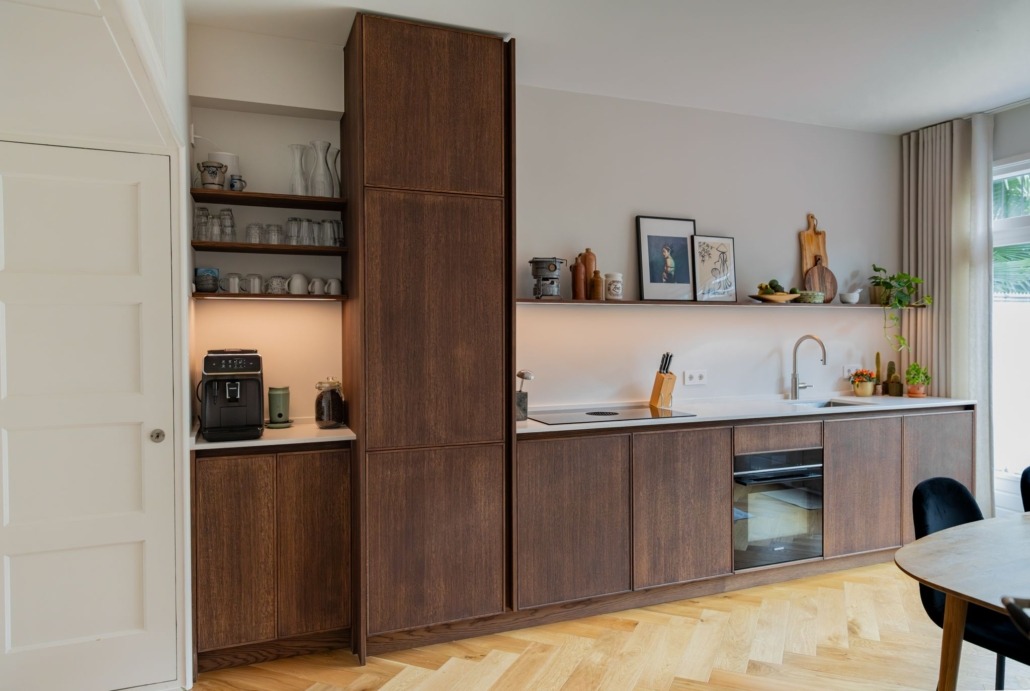 De wandplanken, eveneens van eiken en behandeld met Rubio Monocoat, bieden ruimte voor persoonlijke accenten. Dankzij de geïntegreerde ledstrips ontstaat een warme sfeer, zonder dat het onrustig wordt. Dit soort details zorgen voor een keuken die rust uitstraalt, maar toch indruk maakt.