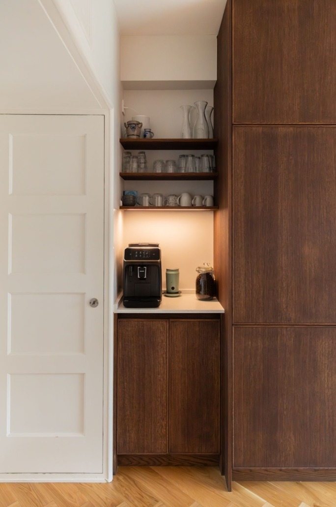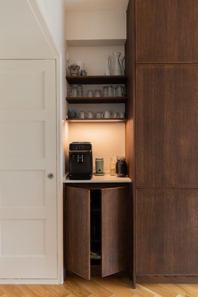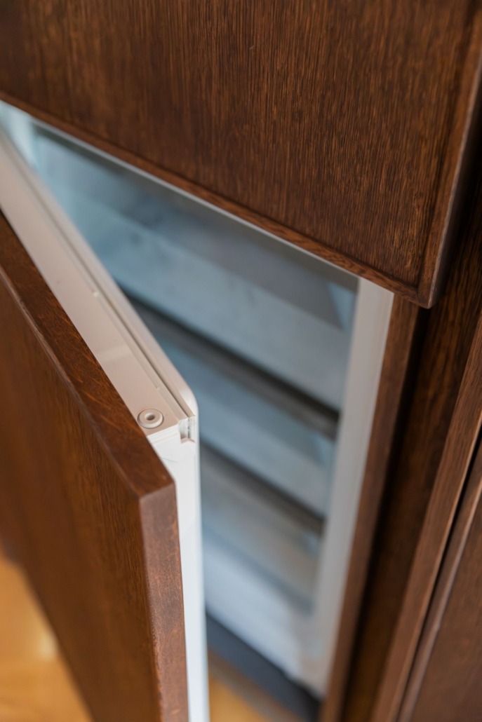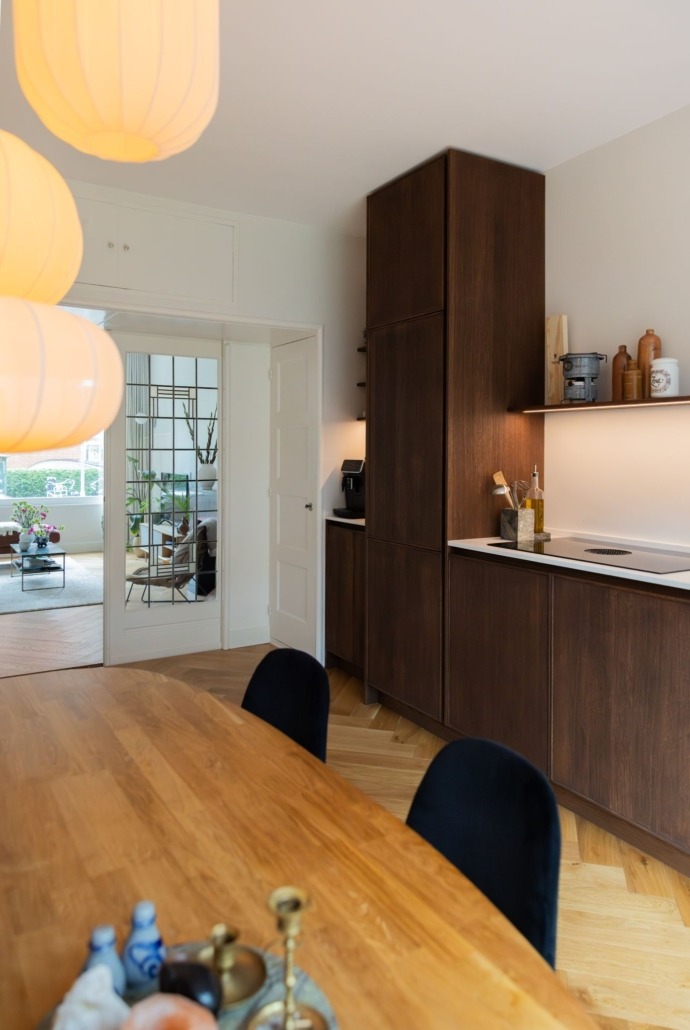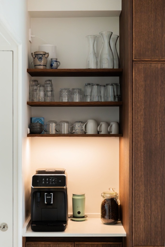 De wandplanken, eveneens van eiken en behandeld met Rubio Monocoat, bieden ruimte voor persoonlijke accenten. Dankzij de geïntegreerde ledstrips ontstaat een warme sfeer, zonder dat het onrustig wordt. Dit soort details zorgen voor een keuken die rust uitstraalt, maar toch indruk maakt.