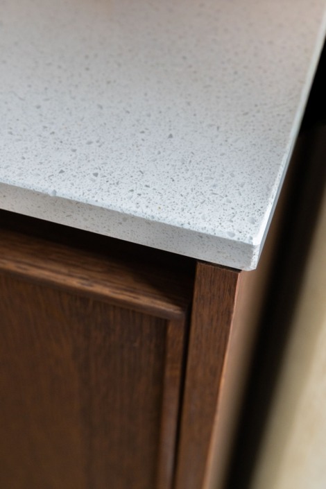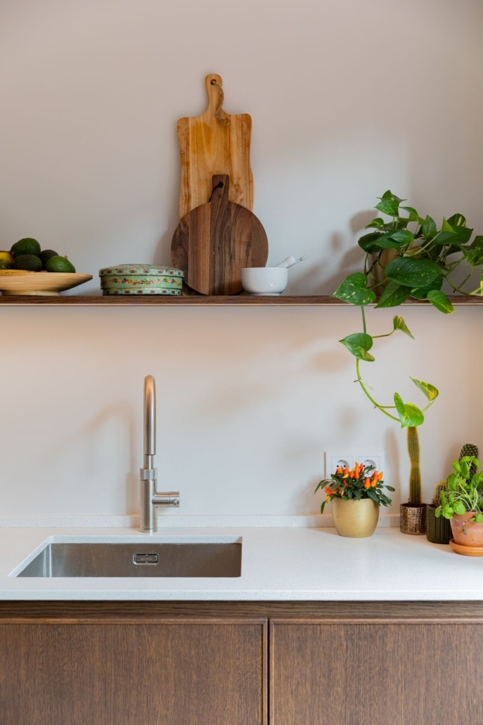 Het werkblad en de achterwand zijn uitgevoerd in composiet. Dit materiaal combineert een zachte uitstraling met praktische voordelen: het is sterk, onderhoudsvriendelijk en past perfect bij de natuurlijke look van het hout. Apparatuur als de Bora kookplaat en Quooker Flex kraan in roestvrijstaal zijn gekozen vanwege hun functionaliteit en ingetogen design. De greeploze afwerking versterkt het strakke lijnenspel.