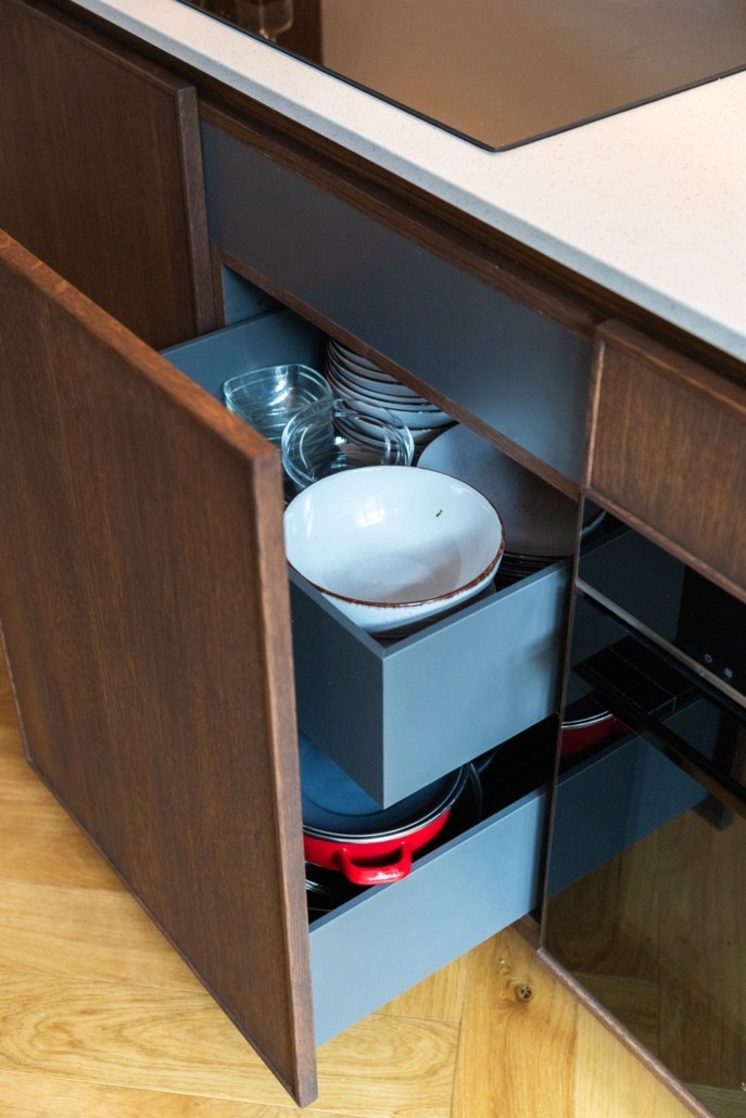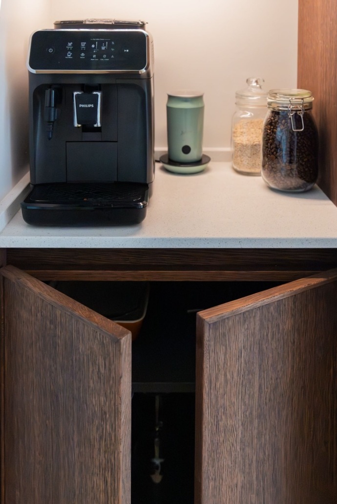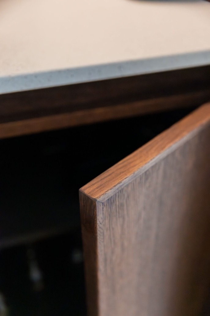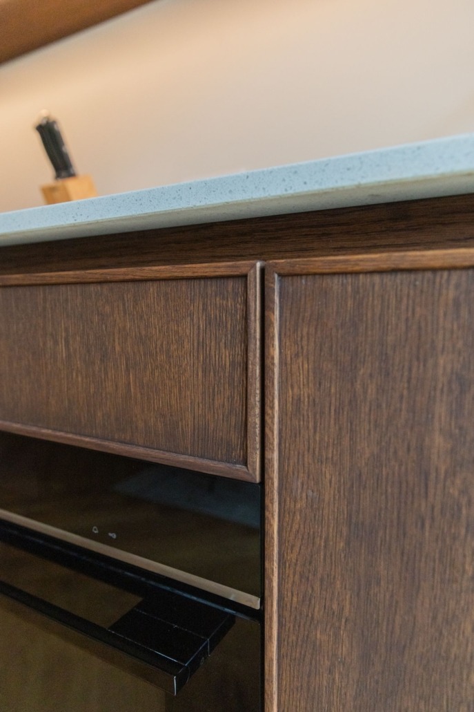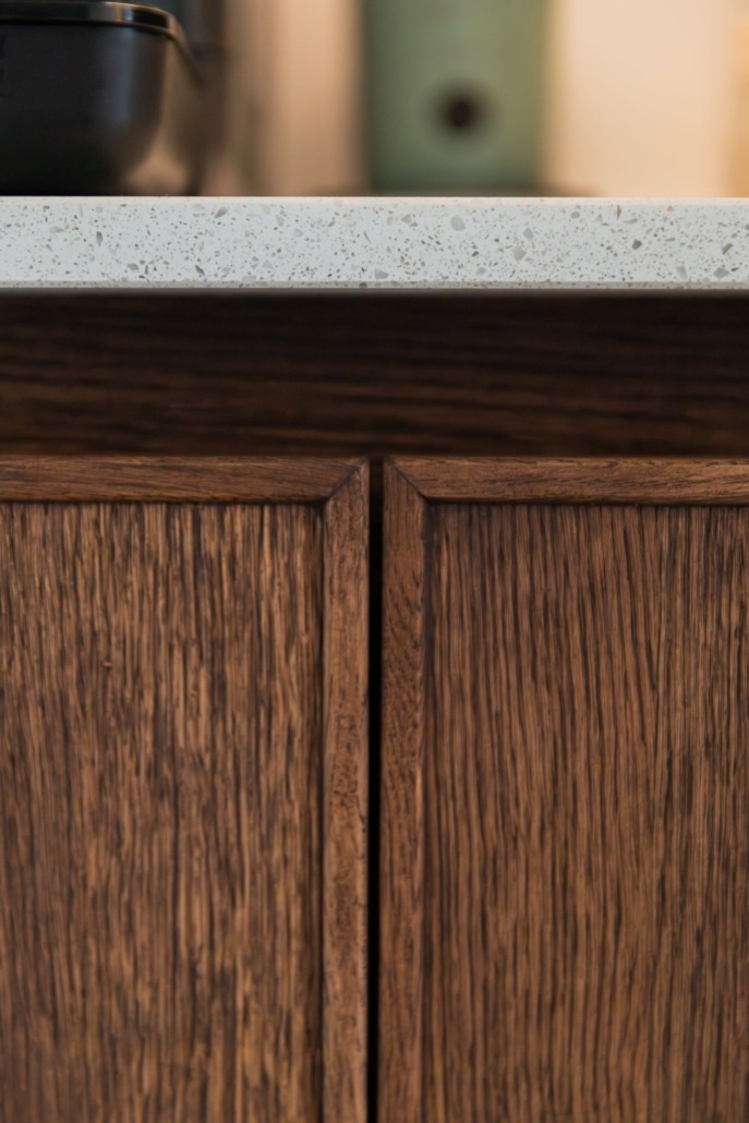 Voor de fronten is gekozen voor eikenfineer met een massieve eiken rand, afgewerkt met Rubio Monocoat olie. Deze behandeling accentueert de natuurlijke kleur en nerf van het hout, en zorgt voor een langdurige bescherming. Het resultaat is een keuken die niet alleen mooi oogt, maar ook bestand is tegen het dagelijks gebruik.