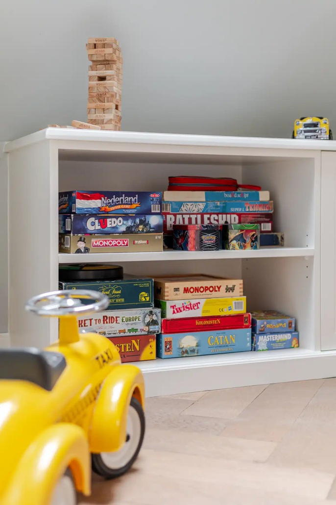 De zolder was jarenlang een speelkamer. “Daar stonden inschuifkastjes van Ikea met bakken. Nu worden de kinderen groter en verdwijnen de speeltjes. Het werd meer een chillplek. Toen dacht ik: het is tijd om het daar ook mooi te maken.”